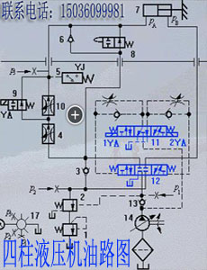四柱液壓機由主機及控制機構兩大部分組成。液壓機主機部分包括液壓缸、 橫梁、立柱及充液裝置等。動力機構由油箱、高壓泵、控制系統、電動機、壓力 閥、方向閥等組成。