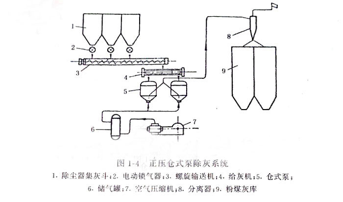 圖1—4是常用的正壓倉式泵除灰系統(tǒng),在此系統(tǒng)中,從干式除塵器分離下的灰,經(jīng)電動鎖氣器、螺旋輸送機和給灰機進入倉式泵、用壓縮空氣將灰吹送。
